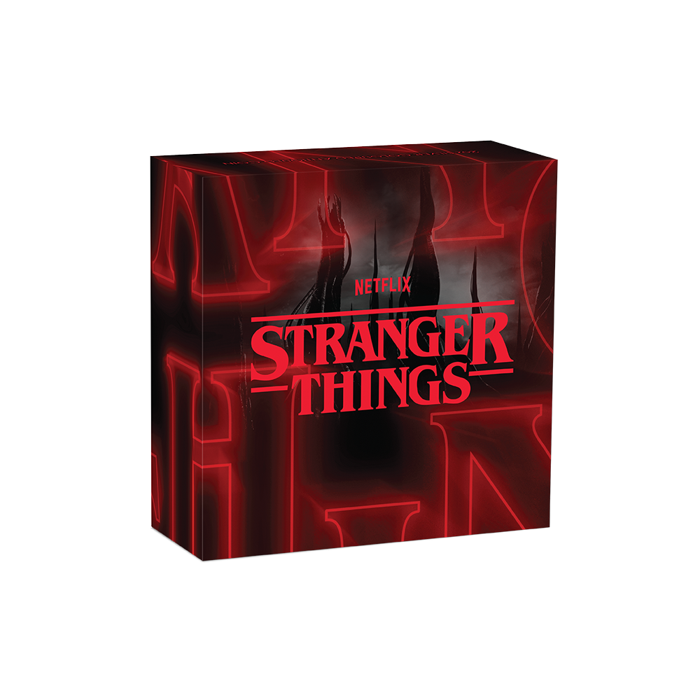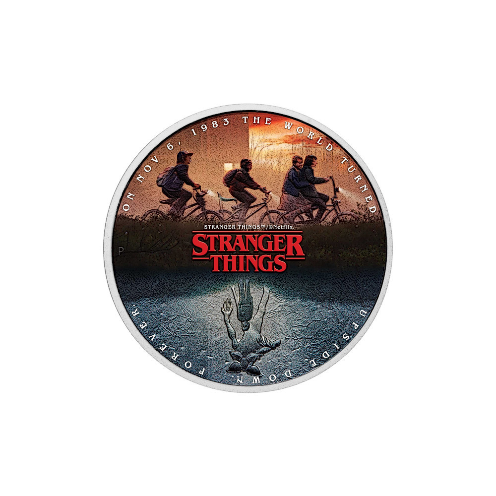 Le revers coloré de la pièce représente le monde mystérieux de Hawkins. La moitié supérieure de la pièce représente Mike, Dustin, Lucas et Eleven lors d'une aventure à vélo, tandis que la moitié inférieure illustre l'étrange monde de l'envers avec Will et la présence inquiétante d'un démogorgon. Le dessin comprend l'inscription "ON NOV 6, 1983 THE WORLD TURNED UPSIDE DOWN. POUR TOUJOURS". ainsi que le logo "STRANGER THINGS" et la marque d'atelier "P" de la Perth Mint.
