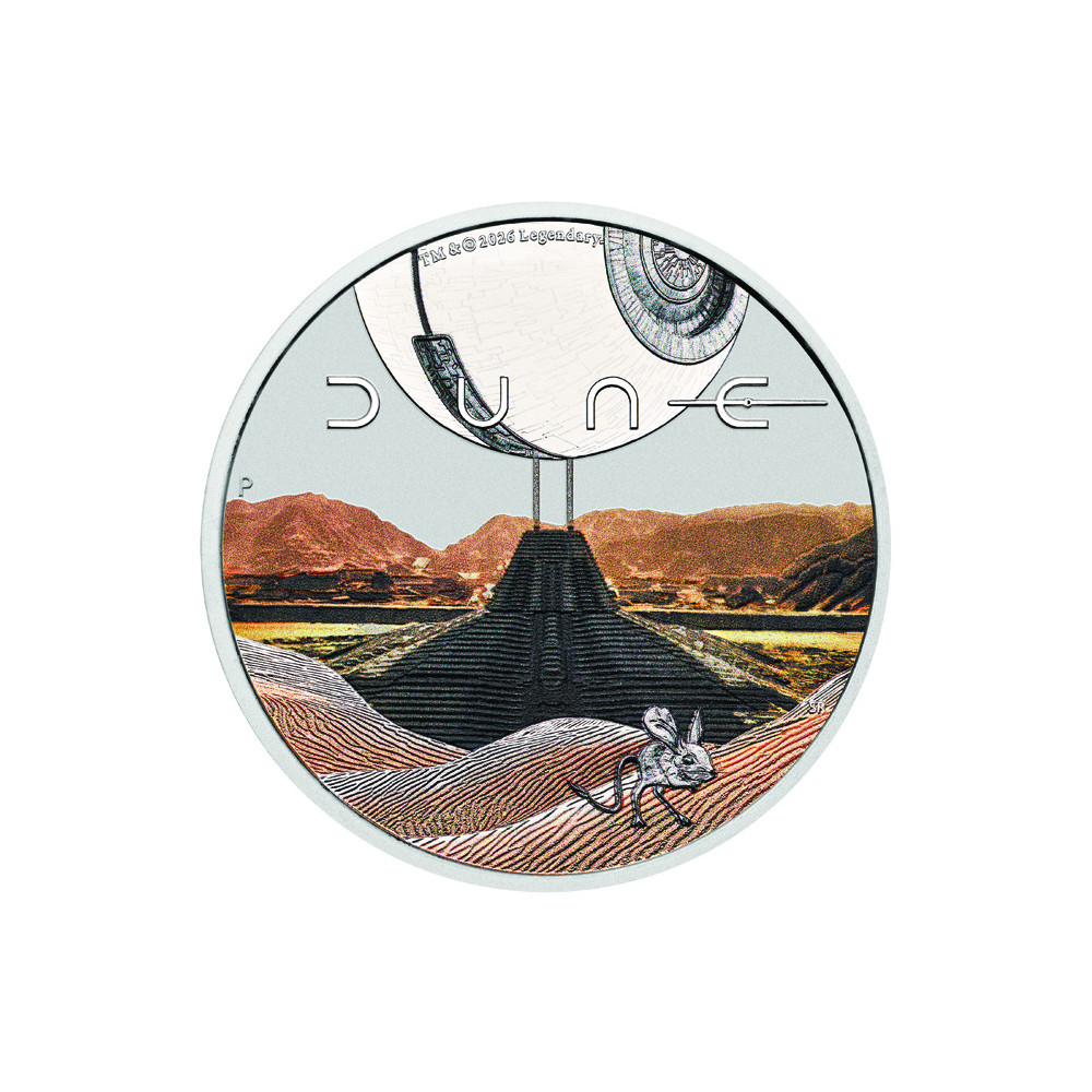 Conçu par Sean Rogers, il représente une scène colorisée de la planète Arrakis. En arrière-plan se trouvent le vaisseau monumental de l’empereur et la tente impériale sur fond de vastes déserts. Au premier plan apparaît la souris du désert Muad’Dib, symbole d’adaptabilité et de force spirituelle du peuple Fremen. La composition comprend également le logo Dune et la marque d’atelier monétaire « P ».