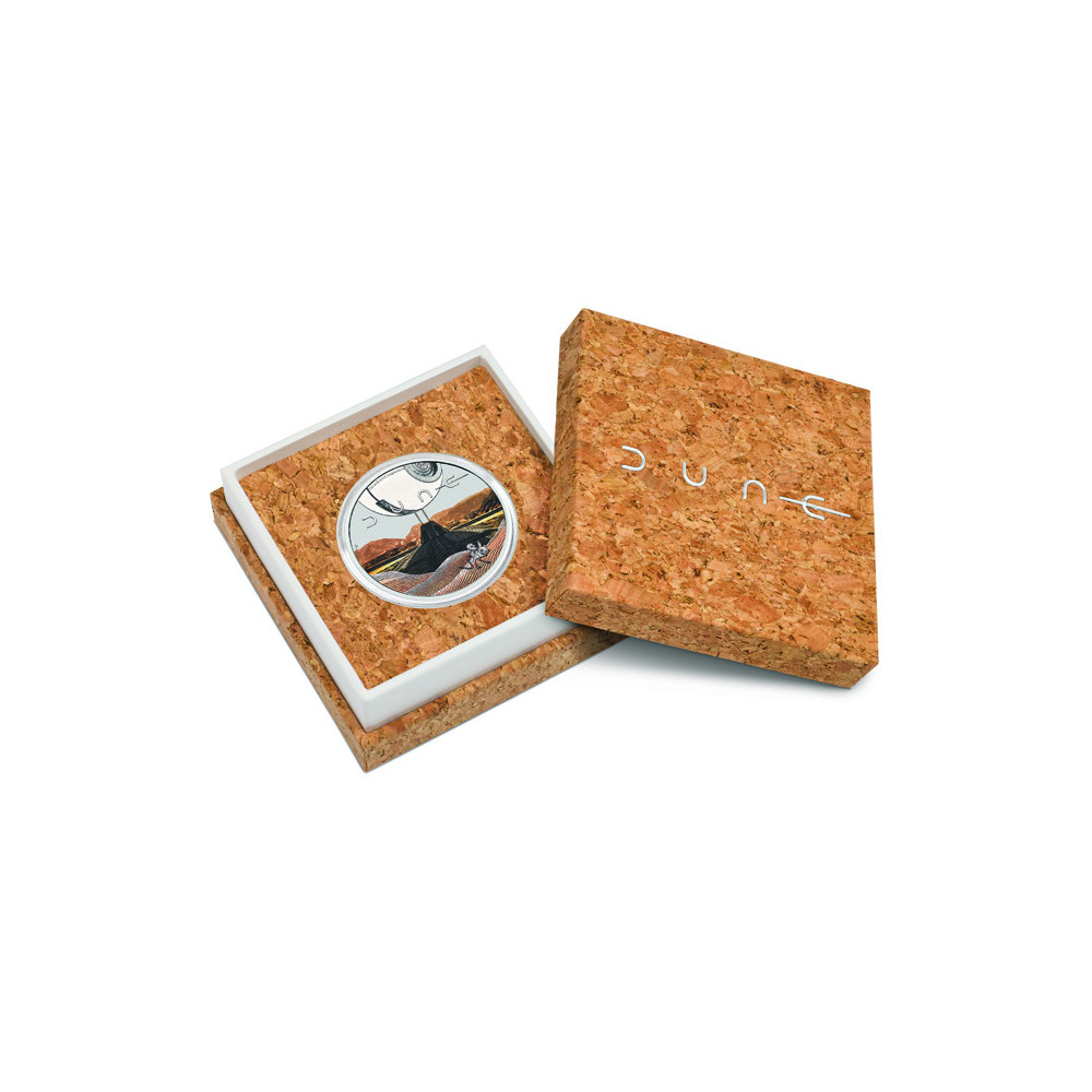 La pièce est frappée en argent pur d’une pureté de 99,99 %, pèse 1 oz (31,107 g) et a un diamètre de 40,90 mm. L’émission de 2026 possède une valeur nominale de 1 TVD et est limitée à un tirage maximal de 3 000 exemplaires. La pièce est fournie avec un certificat d’authenticité numéroté et est présentée dans un étui en liège certifié FSC portant le logo Dune et un emballage extérieur thématique. Il s’agit d’une offre destinée aux collectionneurs et aux fans de cet univers.
