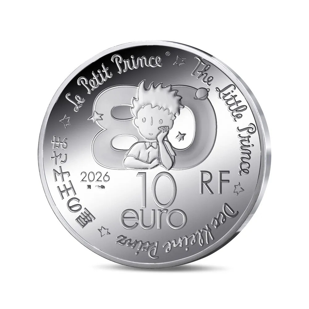 Au revers de la pièce, au-dessus de la dénomination, le logo du 80e anniversaire du Petit Prince, qui consiste en un buste du personnage appuyé sur son bras devant le chiffre 80. Sur la tranche, l'inscription " Le Petit Prince " en français, anglais, allemand et japonais rappelle la dimension universelle de ce personnage. On y trouve également les lettres RF, les marques de l'atelier du graveur et du maître graveur, ainsi que l'année 2026.
