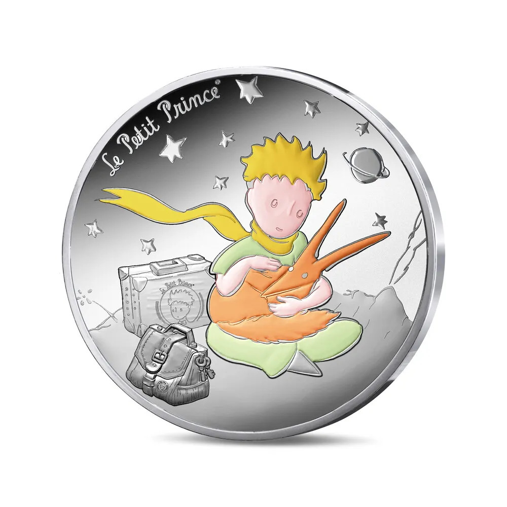Sur l'avers de la pièce, le Petit Prince est assis au centre, les jambes croisées, à la surface de sa planète. Il regarde avec tendresse le renard qu'il tient dans ses bras. À gauche du personnage se trouvent deux valises, prêtes à être emportées par leur propriétaire. Derrière le Petit Prince, le ciel est constellé d'étoiles, parmi lesquelles on distingue Saturne. Sur la tranche de la pièce, le logo du Petit Prince est gravé dans le ciel.