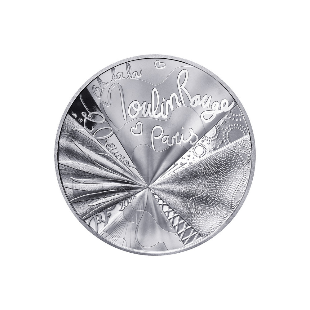Le revers de la pièce est composé autour des ailes emblématiques du Moulin Rouge. Chaque partie de la pièce fait référence à un métier artistique : la création de costumes, le travail des plumes, la broderie, la cordonnerie et le ballet. Ils se mêlent aux éléments de l'univers festif et spectaculaire du Moulin Rouge. L'ensemble rend hommage aux métiers d'art qui contribuent à la magie du cabaret. La partie inférieure de la pièce porte la mention " RF " et l'année d'émission. Dans la partie supérieure de la pièce, la marque de la Monnaie de Paris, Joaquin Jimenez et l'atelier du graveur sont estampillés, ainsi que la dénomination.