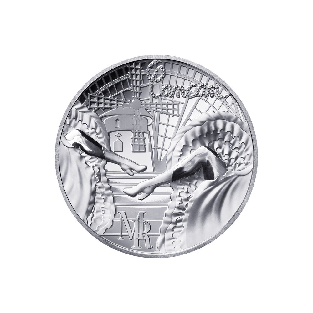 L'avers de cette pièce représente au premier plan deux danseuses de french cancan, saisies dans un mouvement dynamique. À l'arrière-plan, on aperçoit le légendaire Moulin Rouge, avec ses ailes caractéristiques, et en toile de fond, une peinture de cancan français représentant une partie de la Tour Eiffel. Le dessin est complété par les initiales Moulin Rouge.